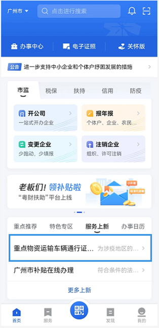 2、在粤商通APP主界面中查看服务新上,查找到重点物资运输车辆通行证申请(见下图),或选择“服务——按业务分类——选择其他——选择更多”。 3、选择“重点物资运输车辆通行证申请”。见下图: 4、填写信息页面,其中带星的为必填项。不带星的为非必填项。录入界面如下: